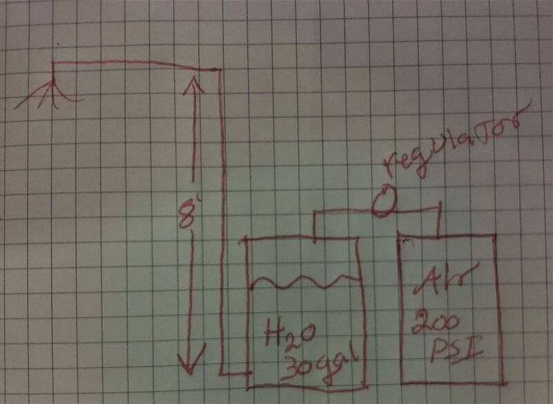 I have been noodling on this problem for a bit and was hoping to have some input from this form. what volume of compressed air, at 200 PSI, will it take to push lets say 30 gallons of water 8 feet up a 3/4" pipe at a minimum of 8 gpm with a minimum pressure of 8psi at the top if there is a regulated pressure between the two tanks? so imagine an air tank with a pipe running from it to the top of a pressure rated water tank, and from the water tank a pipe running from the bottom up 8 feet. How much air, volumetrically, will there need to be in the first tank to push all 30 gallons up the pipe at the minimum pressure and not run out of air by the end. and also how long will it take?