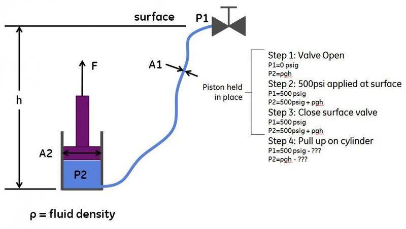 With the surface valve closed I now have a hydraulic lock scenario. However, because the fluid is not perfectly incompressible, I will achieve some movement when pulling up on the hydraulic cylinder. Assuming no seal leakage, this movement will be maxed out when the pressure drops to 0 psi. I can use bulk modulus of elasticity for the control fluid to relate volume and pressure changes but how do I apply in this case? Is the maximum pressure drop 500 psi, 500 psi + head pressure, or somewhere in between? In the long run I am working to determine piston stroke vs F and P1/P2 relation.