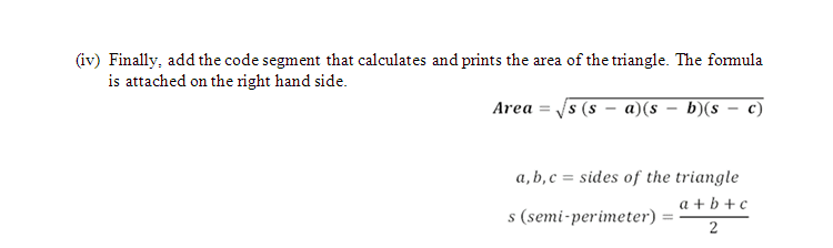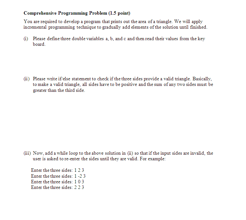 compute the area of a triangle. write an if/else statement to check if the three sides provide a valid triangle. to make a valid triangle, all sides have to be positive and the sum of any two sides must be greater than the third. add a while loop so that if the sides are invalid the user is asked to re enter the sides.