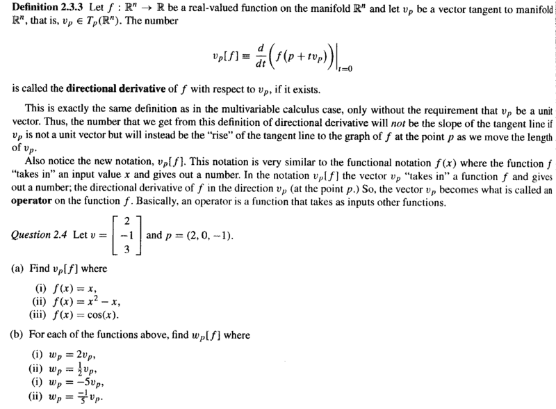 In question 2.4 (a) (i) we are asked to find ##v_p[f]## where ##f## is given as ##f(x) = x## ... ... BUT ... ##v## and ##p## are given in ##\mathbb{R}^3## ... so doesn't ##f## need to be defined on ##\mathbb{R}^3## ... say something like ##f(x,y, z) = x## or similar ...