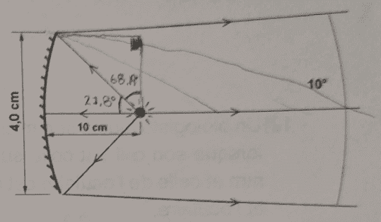 - Participants discuss the geometry involved in determining the focal length and the implications of the mirror's diameter on beam divergence. There are questions regarding the interpretation of angles related to the cone of light produced by the lamp and the nature of the virtual image.