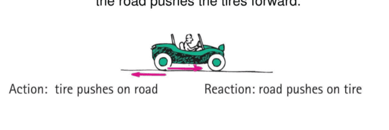 - Theres this picture and it explains that when a car is going on the road the tire pushes backs and the road pushes forward. How is that possible isnt the the road pushing back on the tire from friction so that means the tire is pushing forward and the road is pushing back.