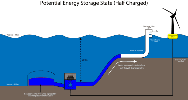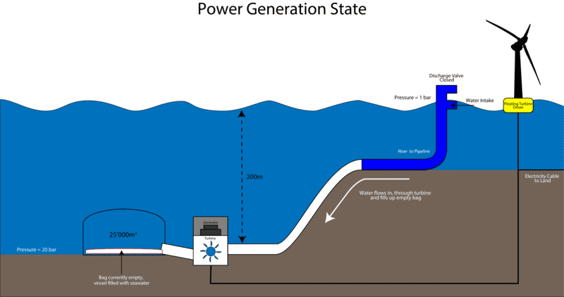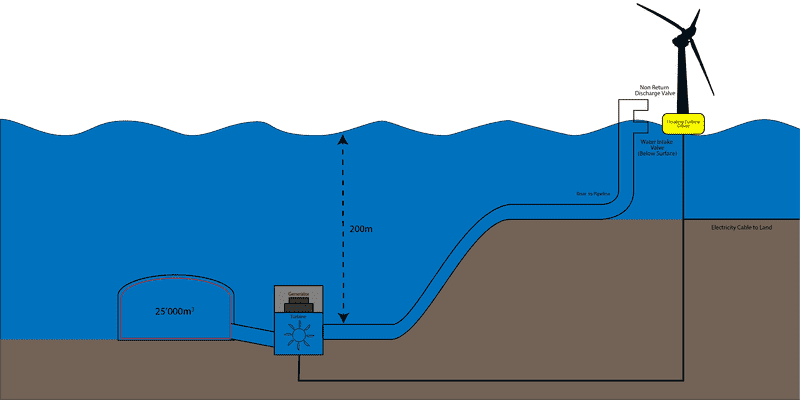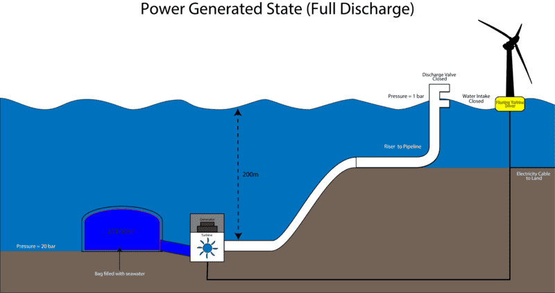 I've attempted to determine the flow rate by choosing a turbine (5MW Francis from https://www.researchgate.net/publication/302969536_The_use_of_LINGO_programming_language_to_develop_a_computer_tool_to_provide_a_technical_and_economic_analysis_of_a_hydraulic_potential_that_allows_the_application_of_Francis_turbines_and_Kaplan_turbin/figures?lo=1) and working backwards, to then find the resulting pipe diameter and head loss. In the model below, the top of the pipe has a valve that will open to let seawater in during the power generation stage (high energy demand), down through a 90/10 Cu/Ni pipe, through a turbine and subsequently fill up the vessel, which is located 200 m below the inlet (Head = 200 m). Vessel design doesn't take into account the pressure at this depth through use of a bag seen here. In times of low demand, using excess energy produced from the wind turbine, the water will be pumped back up to the surface to be stored as potential energy.