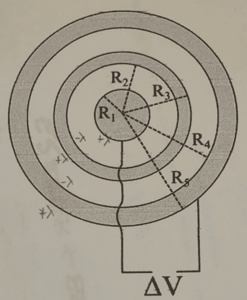 - Consider a long conducting cylinder, of radius ##R_1##. It is surrounded by two conducting cylindrical shells, the first one with internal radius ##R_2## and external radius ##R_3## and the second one with internal radius ##R_4## and external radius ##R_5##. If we put a charge density ##+\lambda## on the conducting inner cylinder of radius ##R_1## the first shell at ##R_2## gets a charge density ##-\lambda##, at ##R_3## it gets ##+\lambda## and the second shell at ##R_4## gets a charge density ##-\lambda## at ##R_4## and ##+\lambda## at ##R_5##.