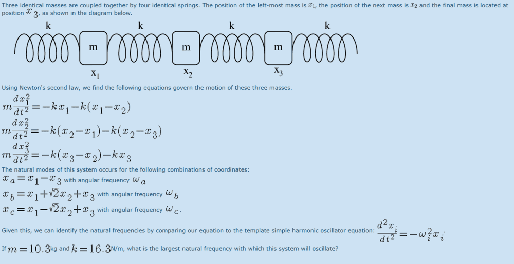 w=sqrt(k/(2m)+k/(2m sqrt(2))). Now this gave me the wrong answer of 2.07 when the answer is suppose to be 2.32, quite a bit higher. The next question also asks the same thing but for the smallest frequency and if I use equation 3 of the above in the same way to get w, I will also get the wrong answer.
