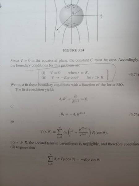- One participant notes a contradiction in the boundary conditions, stating that the textbook claims V=0 at r=R leads to two conflicting equations for coefficients A and B.