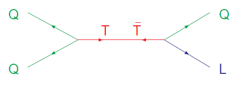 Anyway, then the right hand side vertex would have \overline{T} going in, so then the leading decay mode in this situation (p \rightarrow K^{+} \overline{\nu}) would invove the Q on the right hand side being an \overline{s} with charge of +1/3 (with the spectator u quark (which isn't shown) combining with the \overline{s} to produce the K^{+}), and the antilepton L being neutral, ie. \overline{\nu}.
