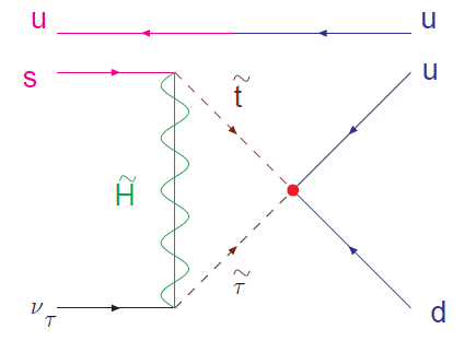 Then we get to the vertices with the Higgsino. At the upper vertex, there's a -2/3 charge going in from the stop, and the anti-strange quark has charge +1/3, so the Higgsino must be a -1 charge (ie. it must be the anti-particle of the superpartner to the H^{+} in the (H^{+}, H^{0}) SU(2) doublet within the SU(5) \psi_{\textbf{5}} multiplet). Similarly the +1 of the anti-stau and the -1 of the anti-Higgsino cancel to give the electrically neutral antineutrino.