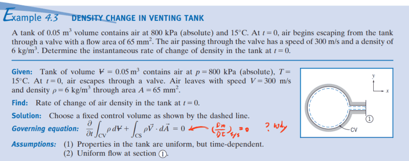 The discussion revolves around the continuity equation in the context of fluid dynamics, specifically regarding the mass within a control volume and its time dependence. Participants are exploring the implications of uniform properties in a tank and how these relate to mass conservation principles.