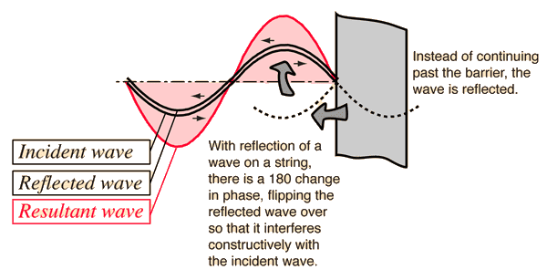 So a standing wave is one which looks to be standing still at certain harmonic frequencies. At these frequencies, when the wave reflects off the end, it will undergo a phase change of 180 degrees. This creates constructive interference as shown below: