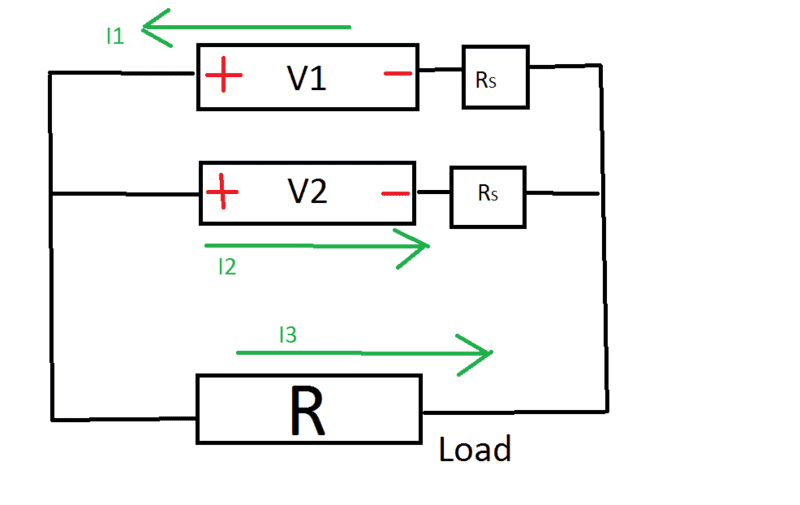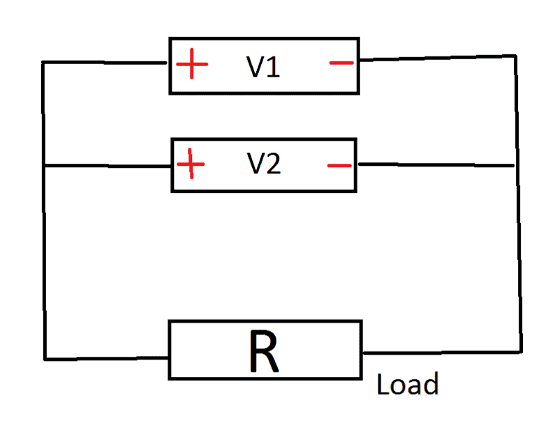 I would like to do now (theoretically) a couple of rather naive things with two batteries with voltages ##V_1## and ##V_2## in parallel charged with an abstract load with resistance ##R##.