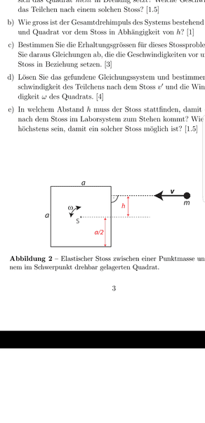 A particle of mass m and and velocity v collides with a square of mass M (at rest)whose movement is confined to rotation about its centet. I must now solve for the angular velocity and the velocity of the particle after the collision (elastic collision)