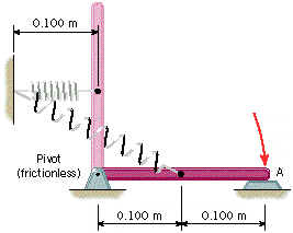 A 0.200-m uniform bar has a mass of 0.790 kg and is released from rest in the vertical position, as the drawing indicates. The spring is initially unstrained and has a spring constant of k = 20.0 N/m. Find the tangential speed with which end A strikes the horizontal surface.