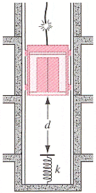 The cable of a 3750 lb elevator in the figure below snaps when the elevator is at rest at the first floor so that the bottom is a distance d = 12.0 ft above a cushioning spring whose force constant is k = 10,000 lb/ft. A safety device clamps the guide rails, removing 1000 ft-lb of mechanical energy for each 1.00 ft that the elevator moves.
