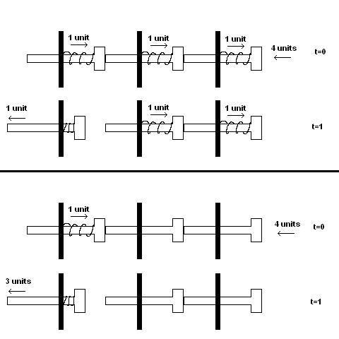If so, what affect will springs have on the system? I have included a diagram of what i think the situation will be but am not sure. will the intermediary pins still remain stationary, with the final pin being pushed out? And the combined force of the springs will be lost from the overall force at the end of the system?