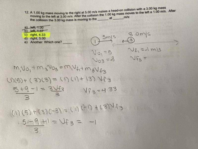 The discussion centers on the conservation of momentum in elastic collisions, specifically addressing the correct application of velocity signs. When calculating momentum, velocities must be assigned negative values for objects moving in the opposite direction. For instance, if mass one has a velocity of +5 m/s to the right, mass two should be assigned -3 m/s to indicate it is moving left. After the collision, if mass one moves left, its velocity is -1 m/s.
