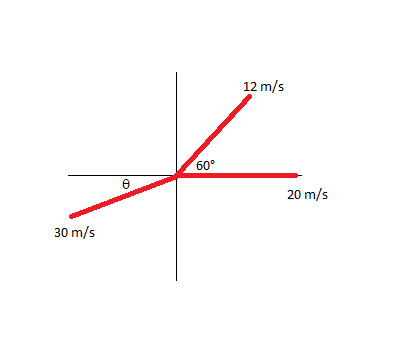 ##0=m_1v'_{1x}+m_2v'_{2x}+m_3v'_{3x}\\0=(2.0)(20)+(3.0)(12\cos(60))+m_3(-30)\cos\theta\\0=58-30m_3\cos\theta\\m_3=\frac {58} {30\cos\theta}##