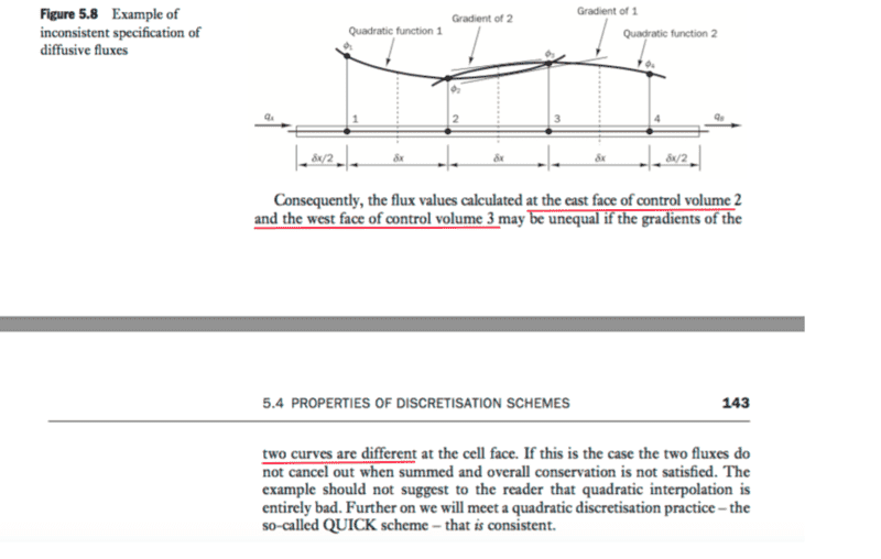 Hi, first of all I am aware of the fact that QUICK SCHEME used in computational fluid dynamics has consistent slope at the sides of node elements (for instance at the left side of node 3 in my attachment same slopes exist) as you can see in my picture/attachment. But I must express that I can prove (differentiating the second order interpolation polynom at side point of nodes) slopes at the left side of node(like in picture) are equal in QUICK SCHEME thus it is consistent but I know there are another schemes like VAN LEER or VAN ALBADA SCHEME which are non linear and I can NOT prove how those SCHEMES may be consistent in terms of slope at the left side of node like QUICK SCHEME. At the centre of length (length between node 2 and node 3 in my attachment) which means left side of node 3 QUICK SCHEME always ensure the consistency of slope and I can prove but HOW DO WE KNOW THAT VAN LEER VAN ALBADA SCHEMES MAY ENSURE THE CONSISTENCY OF slope at the left side of node 3?? How can we PROVE it?