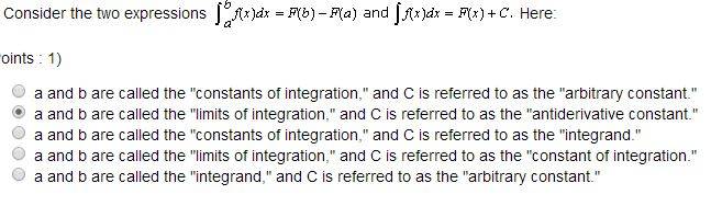 And I just want to check my answer. Am I right? I think that the first formula is the theorem of integration so a and b are limits o integration and I'm not sure about the second formula, I think it's the anti derivative formula making that the anti derivative constant? Or is it another from of the integration formula, making it a constant of integration? Can you help? Thanks!