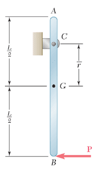 The problem involves a uniform slender rod suspended from a hinge, with a horizontal force applied at one end. The objective is to determine the distance at which the horizontal component of the reaction at the hinge is zero. The discussion revolves around concepts of angular acceleration, forces, and torques in the context of rigid body dynamics.