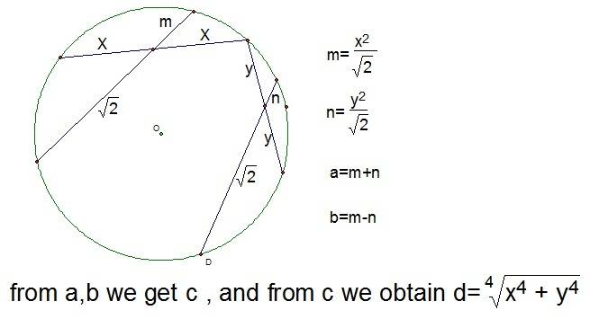 The discussion revolves around the construction of a segment of length $\sqrt[4]{x^4+y^4}$ using a straightedge and compass, given two segments of lengths $x$ and $y$. The conversation explores various proposed solutions and the constraints of classical geometric construction methods.