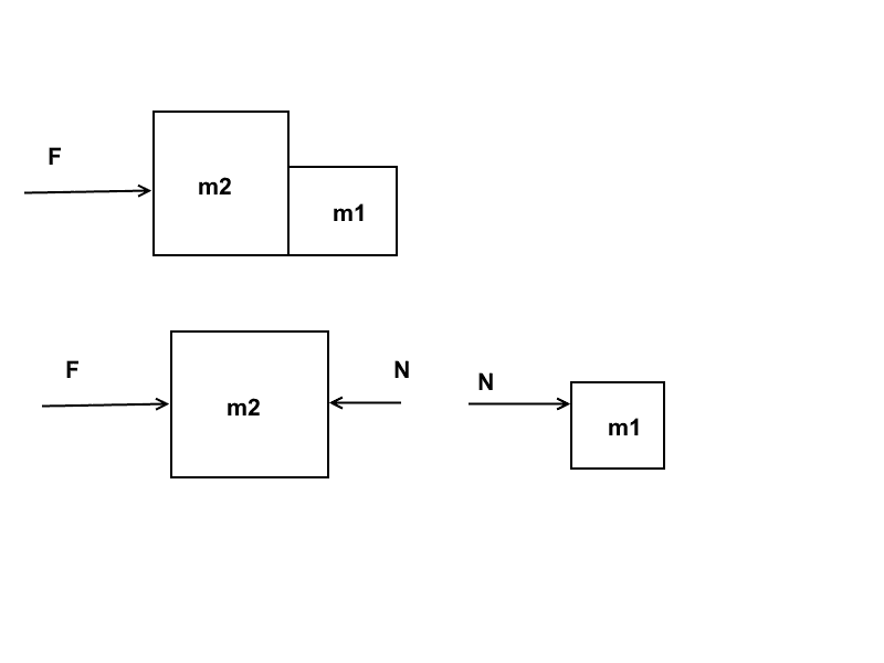 1. For the first body: [Weight] + [Normal force] + [Contact force between m1 and m2] = m1 * a