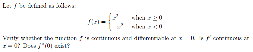 The discussion centers on the continuity and differentiability of a function defined piecewise, specifically at the point \(x=0\). The function's first derivative is established as \(f'(x) = 2x\) for \(x \geq 0\) and \(f'(x) = -2x\) for \(x < 0\). The user seeks guidance on demonstrating the existence of the second derivative \(f''(0)\). It is confirmed that \(f\) is differentiable at \(0\) with \(f'(0) = 0\).