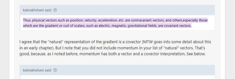 This makes no sense and is contrary to my understanding that a vector (or, say, even the stress tensor) does NOT have ONE manifestation (the latter could be contra, co or mixed)