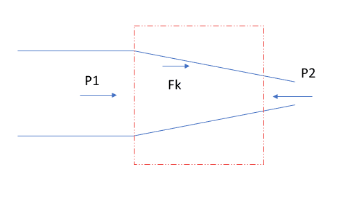 The discussion revolves around a fluid mechanics problem involving a control volume (CV) where pressures P1 and P2 act on either side. The original poster is trying to understand the force Fk acting from the water on the wall of the CV and why the answer manual indicates that Fk should be negative.
