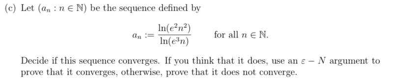 - Participants express uncertainty about determining convergence and discuss the relevance of constants in the sequence. Questions arise about logarithmic properties and their application in the context of convergence. There is also a mention of using L'Hospital's Rule to analyze the limit of the sequence.