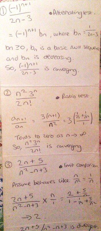 Would somebody be kind enough to check whether I've picked the right convergence tests for each of these and reached the right answers? There are no solutions in the book.