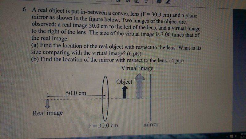 A real object is put in-between a convex lens (f = 30.0cm) and a plane mirror as shown in the figure below. Two images of the object are observed : a real image 50.0cm to the left of the lens and a virtual image to the right of the lens. The size of the virtual image is 3.00 times that of the real image.