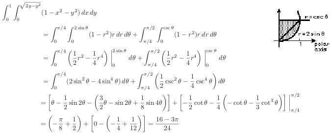 int int (1 - x^2 - y^2) dx from 0 to sqrt(2y - y^2) dy from 0 to 1