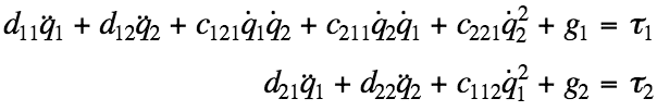 equations above are descriptive of a system with two configuration variables, q1 and q2. inputs are tau1 and tau2. d and c values are given.