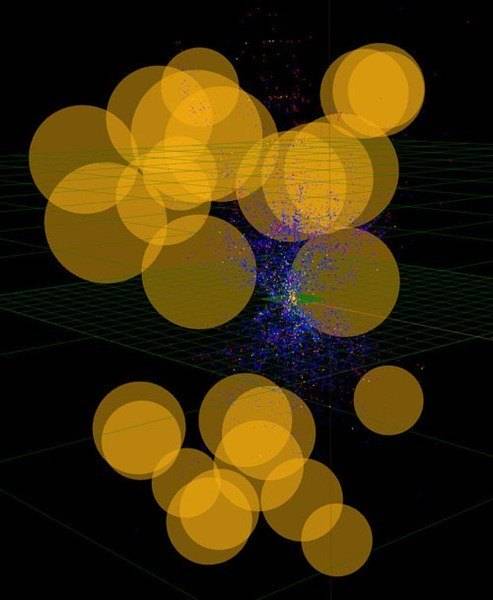 Each yellow sphere represents a void, according to the paper (with radius = half the quoted diameter). It's evident that this distribution doesn't match the marked galactic distribution (small dots). The yellow spheres are way too large. I'm yet unable to figure out what I may be doing wrong.