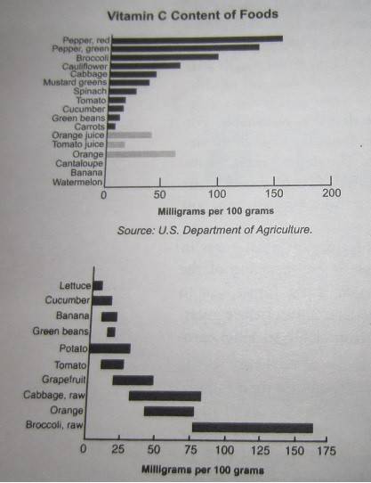 Participants are dealing with a graph that presents Vitamin C content in a range for broccoli, which adds complexity to the discussion about how to interpret the data for comparison with tomatoes. There are also references to varying Vitamin C content in different sources, which may affect the conclusions drawn.