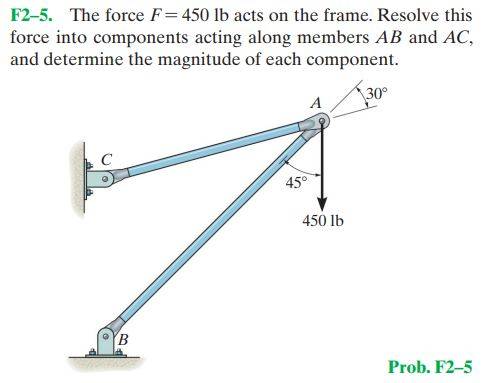 - The force F = 450 lb acts on the frame. Resolve this force into components acting along members AB and AC, and determine the magnitude of each component. (Figure is attached below)