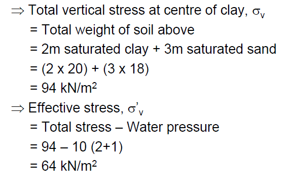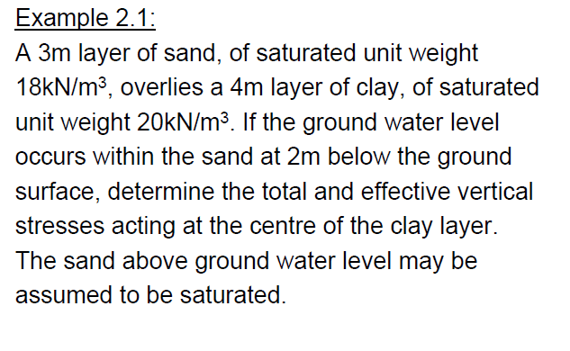 The discussion revolves around the calculation of total vertical stress at the center of a clay layer in a soil mechanics context, specifically addressing the assumptions made about the saturation of soil layers above the groundwater table. The scope includes theoretical considerations and potential errors in approximations used in calculations.