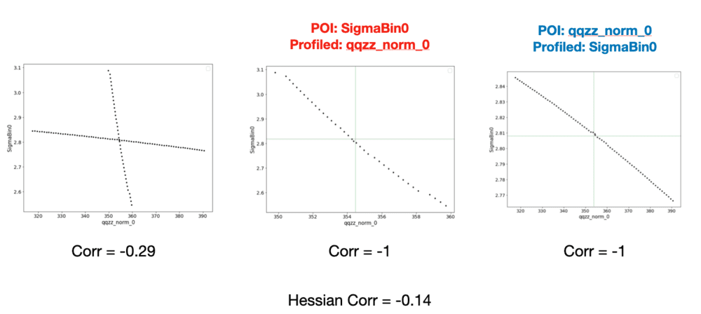 Then I tried a different approach: studying the SigmaBin0 vs qqzz_norm_0 values when one of the parameters is the Parameters Of Interest (POI) and the other is profiled, and viceversa. I mean, I scan the likelihood function along SigmaBin0 while "watching" the qqzz_norm_0 profiled values, and then I run another scan along qqzz_norm_0 while "watching" the SigmaBin0 profiled values. My expectation is to find the same trend in both cases, but what I find is the right plot in attachment. The vertical line is the former case, instead the horizontal line is the latter one. If I apply the definition of correlation (ratio of the covariance wrt the standard deviations) I get a correlation of -0.29.