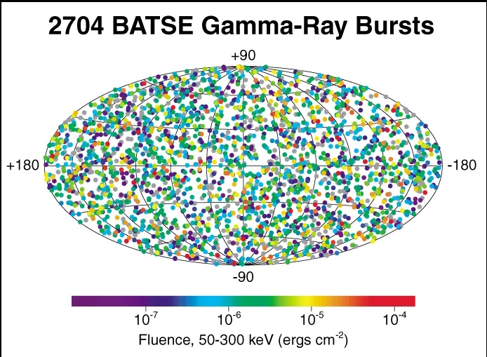 2. The sky map for gamma-ray bursts is given as a stretched globe, on which high latitudes are visible as if at an angle, although in fact everything in the sky is distributed equally. The size of the dots on the map is the same everywhere, and in theory it should be smaller at high latitudes due to the visual flattening of the dots, the plane of which is at an angle to us. This creates the illusion of greater density of dots at high latitudes. In addition, the equator is greatly stretched horizontally, which means that in the case of a uniform distribution of bursts in the sky, there should be a lower concentration of points in the equatorial zone on the map. Just as if we were to stretch a sheet of rubber to the right and left at the same time, the central part would stretch more strongly and the amount of rubber per unit area there would be less than closer to the edges. If we mentally compress the equatorial part of the map so that we get a round globe (as it should be on a spherical sky), then the concentration of points in the equatorial zone will increase. If this logic is correct, then this can also be an explanation for the apparent relative uniformity of the distribution of gamma-ray bursts, and in fact their concentration is towards in plane and in the center of the Milky Way.