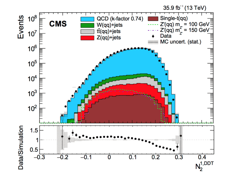 Hello! The attached pic is from this paper. So on the y you have counts and on the x you have a certain parameter used to search for a certain resonance. The colored part is the Standard Model (SM) prediction and the black dots are the obtained data while the dashed lines are the simulated prediction for the contribution of this new resonance. Obviously no deviation is observed in the region of interest. However if you look in the last 5-7 bins (maybe except the last 2), especially in the bottom plot, the data points deviate significantly from the predicted background. Is it because the simulation didn't focus much there (as it is outside the region of interest for the specific resonance) or it can be something deeper (the points seems to be quite a few sigma below the predicted model)? If the simulations are correct over the whole presented range, shouldn't these points be closer (within the error bars) to the predicted model? Thank you!