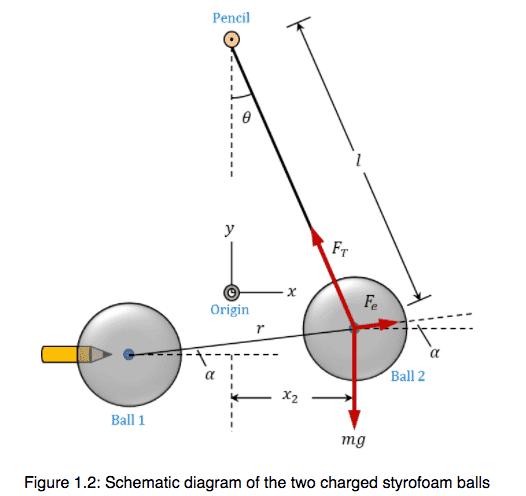 This is a question from my coulomb's law lab, where 2 styrofoam balls where charged, one was hung on a string and the other was brought closer to it from 20cm away and the change in the hanging ball position was recorded. (x2,y2) is the position of the hanging ball, and (x1,y1) is the position of the other ball that is moving closer to the hanging ball. r is the separation distance between the 2 balls. L is the length of the string that the ball is hung on. If this is not clear enough, please see these links: