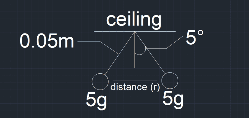 Two small balls, each of mass 5.0 g, are attached to silk threads 50 cm long, which are in turn tied to the same point on the ceiling, as shown below. When the balls are given the same charge Q, the threads hang at 5.0° to the vertical, as shown below. What is the magnitude of Q? What are the signs of the two charges?