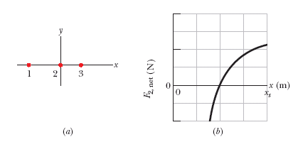 Figure (a) shows charged particles 1 and 2 that are fixed in place on an x axis. Particle 1 has a charge with a magnitude of |q1| = 19e. Particle 3 of charge q3 = +16e is initially on the x axis near particle 2.Then particle 3 is gradually moved in the positive direction of the x axis. As a result, the magnitude of the net electrostatic force on particle 2 due to particles 1 and 3 changes. Figure (b) gives the x component of that net force as a function of the position x of particle 3. The scale of the x axis is set by xs = 1.70 m. The plot has an asymptote of F2,net = 0.8688 × 10-25 N as x → ∞. As a multiple of e and including the sign, what is the charge q2 of particle 2?
