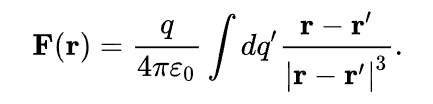 $$ \mathbf{E}(\mathbf{r}) = \frac{1}{4\pi\epsilon_0} \int \frac{\rho({r})}{r^2} d\tau $$