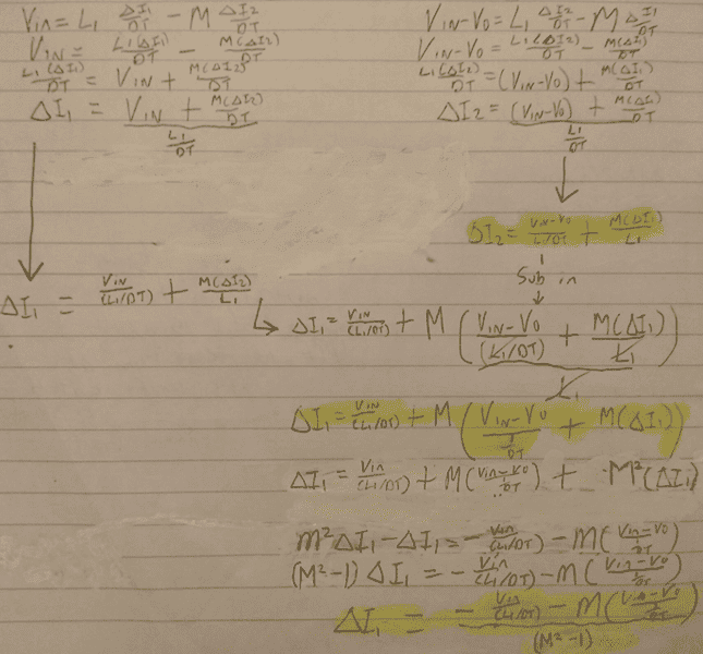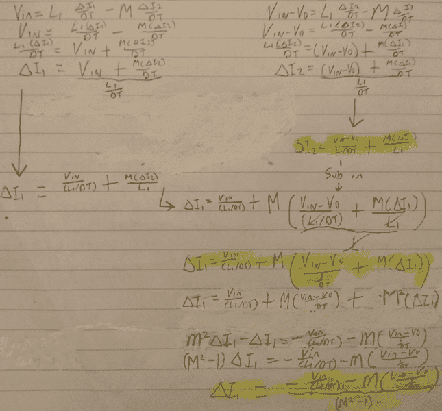 The discussion revolves around calculating the ripple current in a coupled inductor boost converter, specifically focusing on the variables ∆i1 and ∆i2. Participants are exploring the derivation of formulas for these ripple currents, considering the effects of voltage levels and time intervals in the converter's operation. The context includes design considerations for a boost converter as part of an assignment.