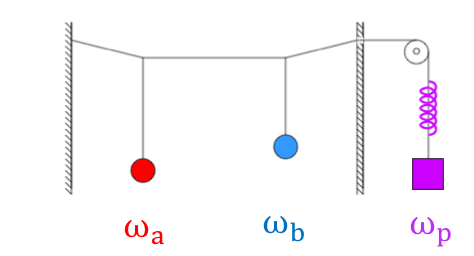 If the balls(red and blue) were oscillating at their own natural frequencies, and an external force is driven(purple), how would the balls' frequencies be determined?