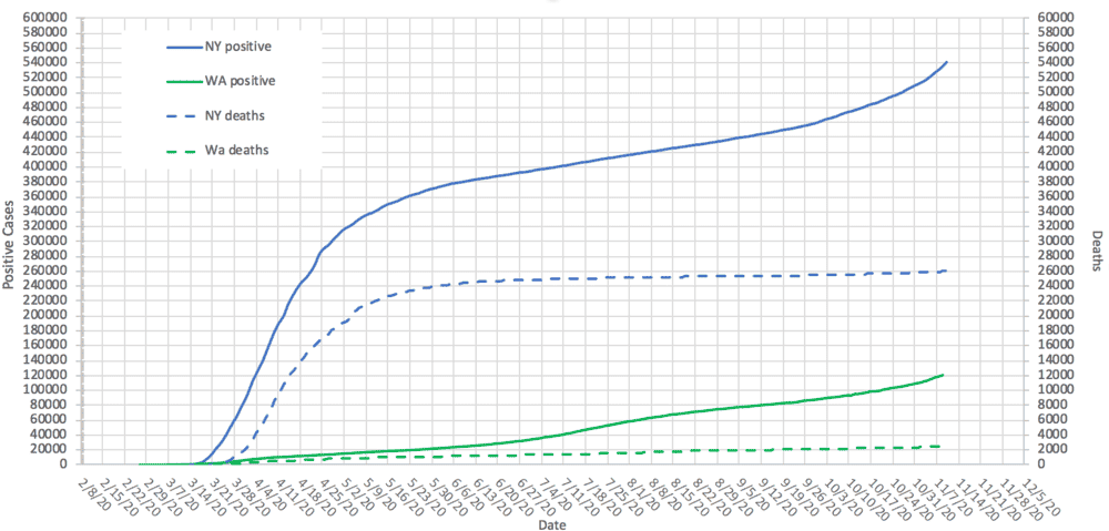 Some sites (and media healdines) have State of Texas passing 1 million COVID-19 cases. Officially, the state's dashboard reports 974,230 positive cases as of November 10, 4:50 pm EST. Covidtracking.com reports this number. ncov2019.live reports a higher number 1,042,439, which apparently includes some probable or uncertainty estimate. Certainly, fatalities in Texas are reported at 18,863 while ncov2019.live reports 19,453 fatalities. Texas and California are both approaching 1 million cases, with Florida in third place.