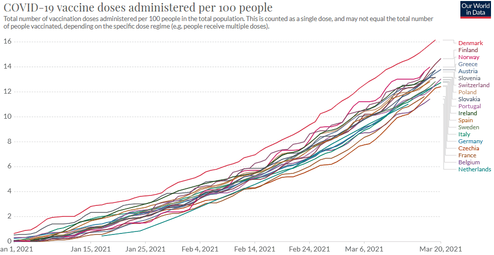 Denmark is a bit ahead (and the UK is outside the scale), but look how close many European countries are with vaccination progress - including some non-EU countries in the same region, this is not purely EU distribution of vaccines.