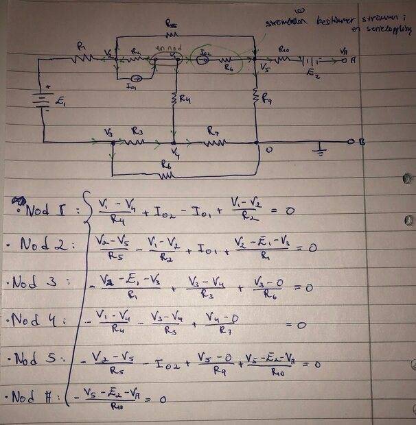 Hey, I am having big issues with the following question. I have done node analysis to get the following equations 1-5 and the equation for A i have removed because it was not needed apparently. When solving the equationsystem I get that the voltage in node 1-5 is (using matlab)